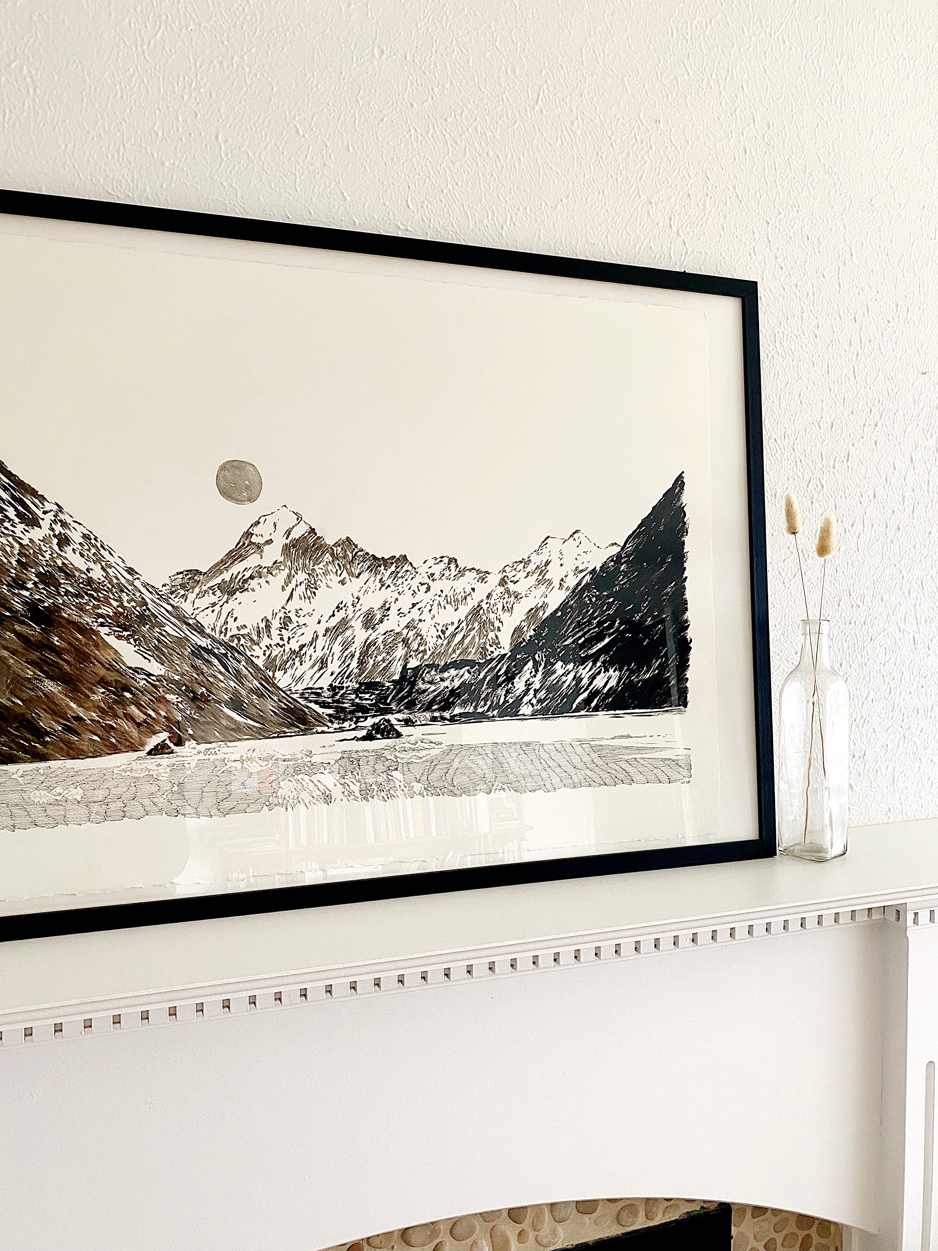 The MOUNTAINS Collection, and this piece, is an exploration of brush + line, using the metaphorical form of MOUNTAIN to see how the marks of paintbrush and pen or pencil, with their contrasting textures, can work together to model the tactile surfaces of land.