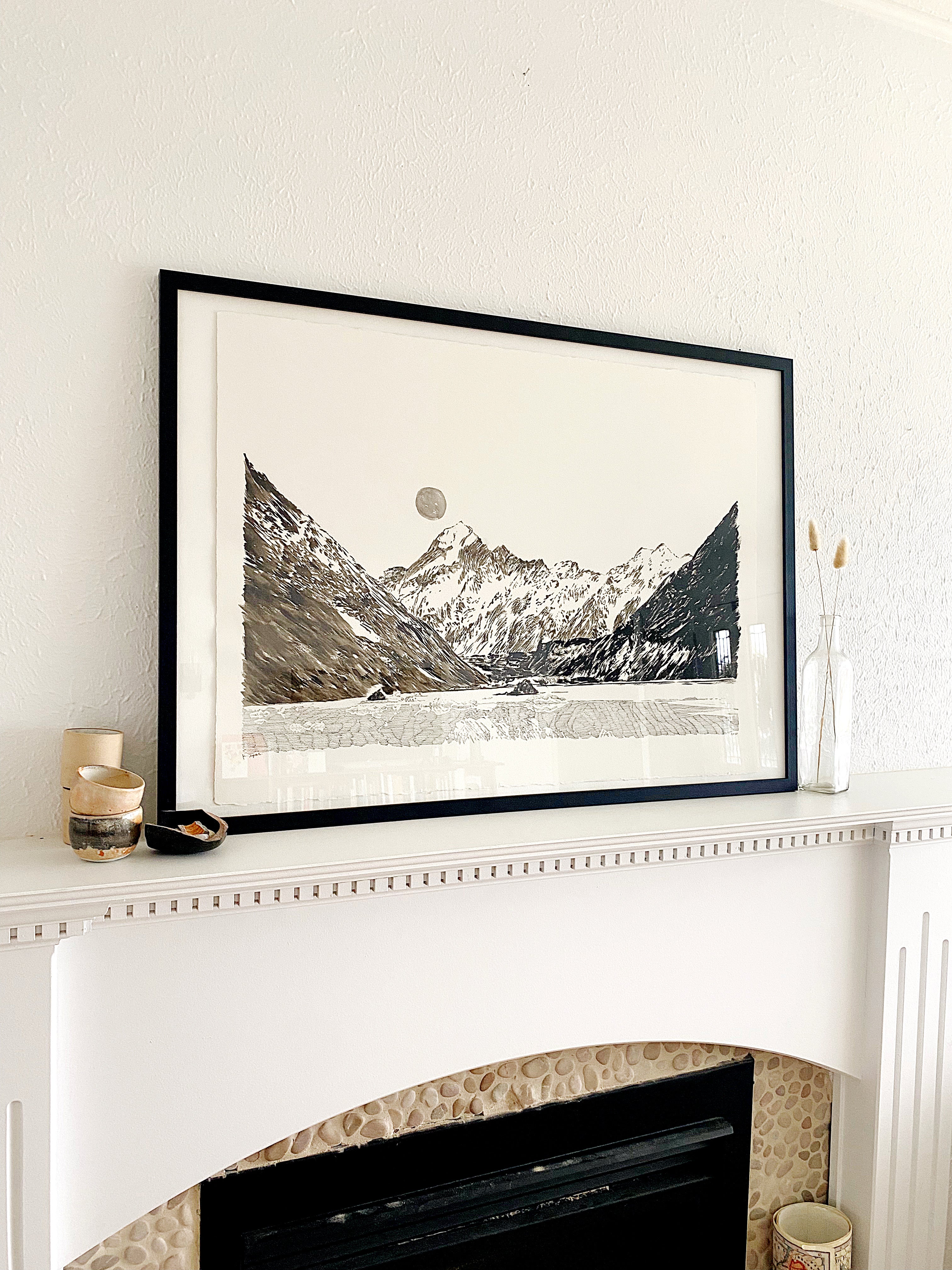 Watercolor strokes in shades of black build up the mountains that envelop Glacier Lake - all reflected in fine line ink strokes in the shimmering lake. And a full moon is rising.