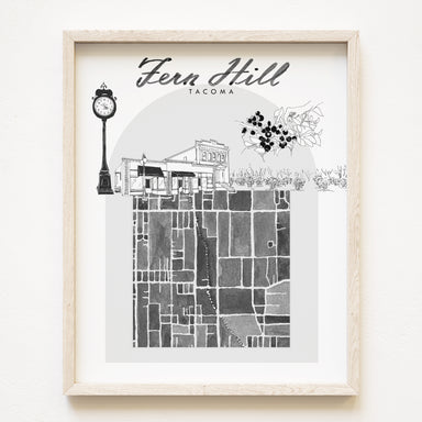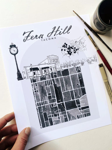 Celebrate your Neighborhood in TACOMA, Washington: FERN HILL! This is a Black and White PRINT of my Original Watercolor City Blocks Map. PLUS my sk...