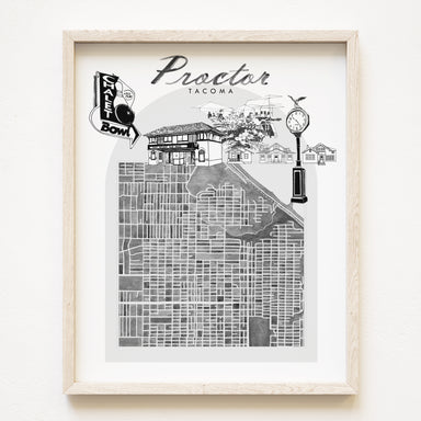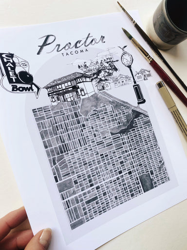 Proctor District, North Tacoma Neighborhood Map. This is a black and white PRINT of my original watercolor map-painting. PLUS my sketches of the ne...