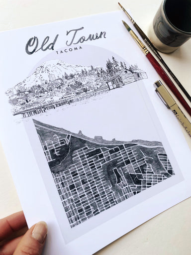Celebrate your Neighborhood in TACOMA, Washington: OLD TOWN! This is a Black and White PRINT of my Original Watercolor City Blocks Map. PLUS my ske...