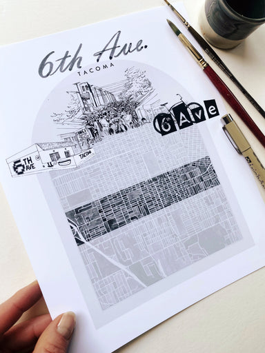 Celebrate your Neighborhood in TACOMA, Washington: SIXTH AVE! This is a Black and White PRINT of my Original Watercolor City Blocks Map. PLUS my sk...