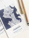 My hand-drawn ink line drawing, tinted deep dark blue, is styled to look like a "blueprint" and the map is accentuated by my sketch of the Bainbridge Ferry.