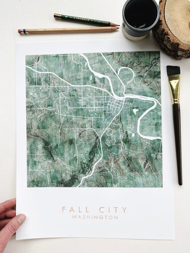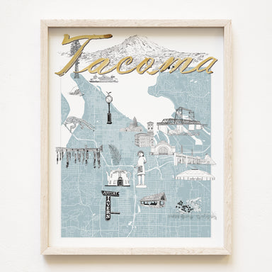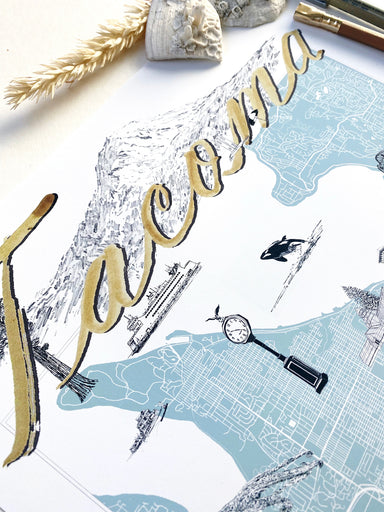 TACOMA, Washington Watercolor City Map + Icons Art Print. For your Map Wall, memento of your travels, reminder of home. The hand-painted cursive ...