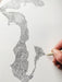 My hand-drawn ink line drawing, tinted deep dark blue, is styled to look like a "blueprint" and the map is accentuated by my sketch of the Coupeville Ferry.