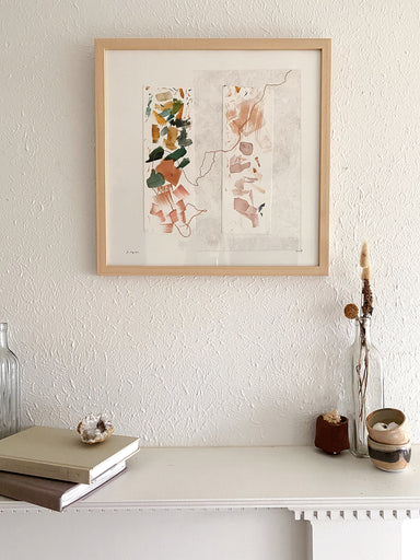 Inspired by the cascading layers of rolling landscape. Mixed-media: watercolor, graphite line, handmade pigment paint, hand stitching. 12” x 15” Te...