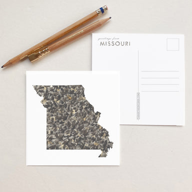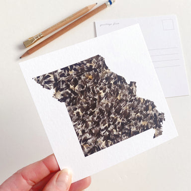 MISSOURI! This is a POSTCARD of Missouri from my "Urban Fabrics" Map Collection in "COAL" tones of black with warm bits of my handmade ochre pigmen...