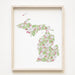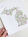 This is a PRINT from my "State Flowers" Map Collection. The Michigan State Map is rendered in a mass of apple blossom, its ubiquitous state flower, hand painted by me with watercolor.