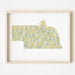 This is a PRINT from my "State Flowers" Map Collection. The Nebraska State Map is rendered in a field of waving goldenrod, its ruggedly elegant state flower, hand painted by me with watercolor.