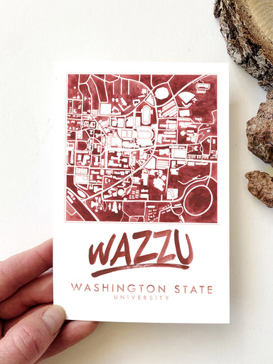 My Washington State University (WSU/WAZZU) hand-painted Watercolor Campus Map in WSU crimson red, now on a Postcard - Show some love for your favor...