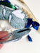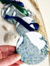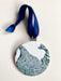 Ornament measures 3.5" x 3.5" (Circle) and hangs from a satin ribbon, blues and greens to complement the art map.
