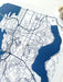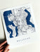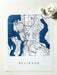 This is a Print of my original ink line drawing, with parks delineated in a diagonal line pattern, tinted deep dark dark blue, styled to look like a “blueprint.”