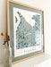Light wood Frame with dark green mat, glass face, is included. Custom framed by ArtCo Framing in Tacoma.