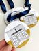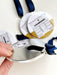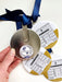 Ornament measures 3.5" x 3.5" (Circle) and hangs from a complementary navy blue satin ribbon..